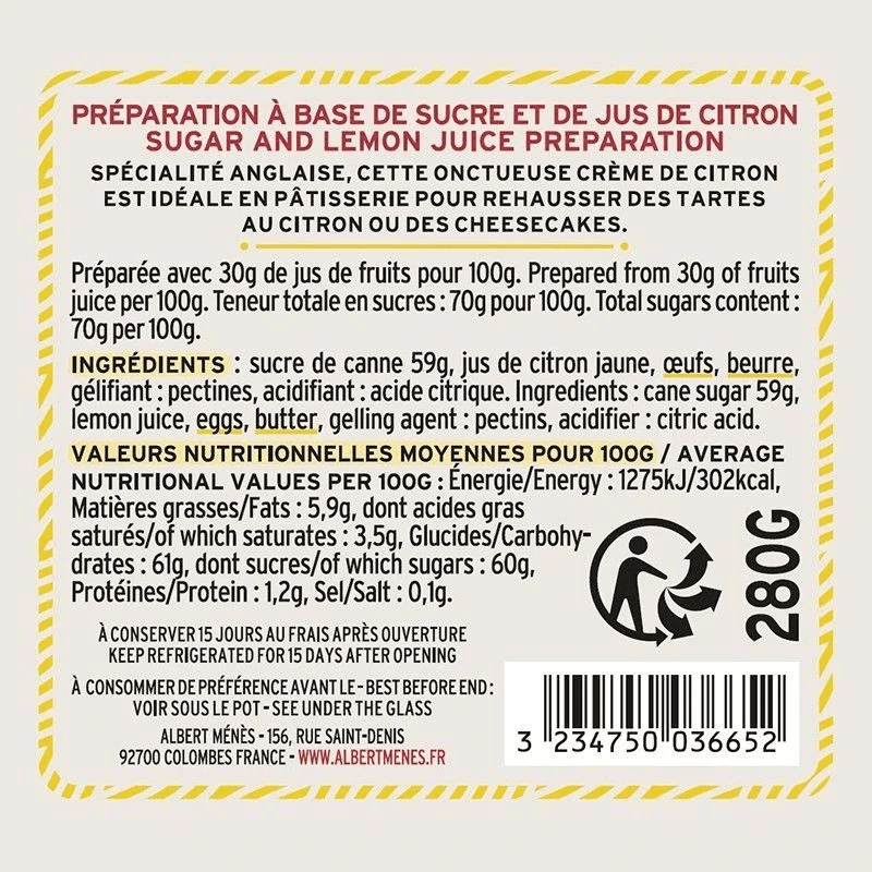 Albert Menes Gourmet Lemon Curd is a sweet and zesty ingredient that can be used in a variety of dessert recipes. Made with fresh lemon juice, sugar, egg yolks, and butter, this creme de citron has a rich texture that makes it a wonderful pie and pastry filling.
