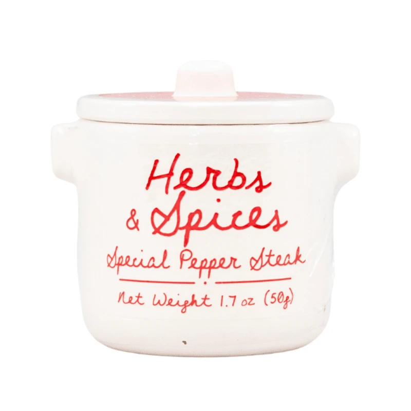 Aux Anysetiers du Roy Pepper Steak Spice contains a blend of crushed peppercorn, mustard seed, and powdered savory. These spices are packed in a beautiful, reusable ceramic jar. Add this Pepper Steak Spice to a BBQ gift basket for anyone who loves to grill.