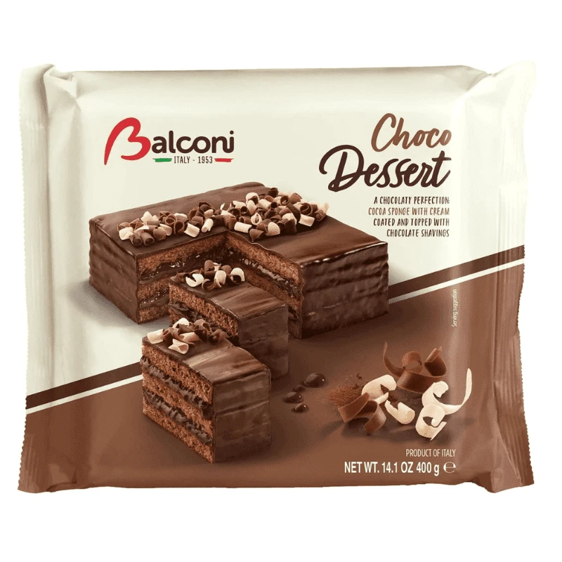Balconi Choco Dessert is a classic Italian sponge cake with a rich chocolate liqueur filling, cocoa frosting, and chocolate shavings. This luxurious treat is perfect for sharing as an after-dinner treat. Pair this Italian dessert with espresso, tea, or even a glass of dessert wine. You can also add this chocolate-flavored cake to a gift basket for anyone with a sweet tooth.