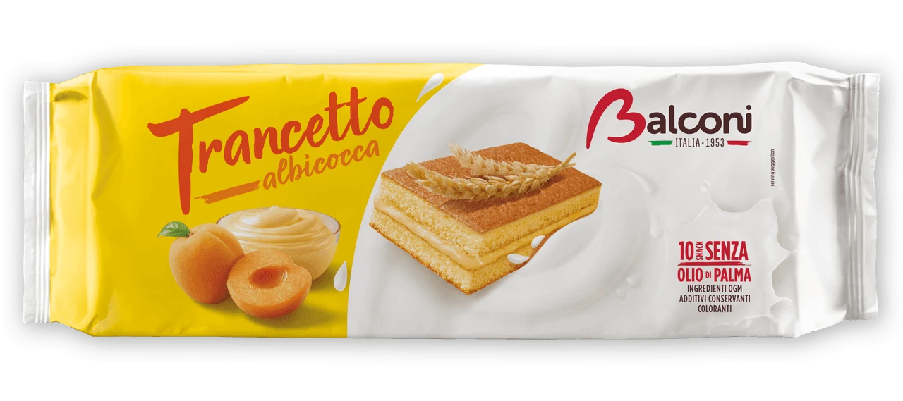 Balconi Trancetto Snack Cakes with Apricot Cream Filling are Italian dessert cakes that will satisfy a sweet tooth. Light and fluffy vanilla sponge cakes are layered with apricot filling. Enjoy with a cup of espresso, serve as a post-dinner sweet, or pack in a lunch box to end the midday meal with a smile.