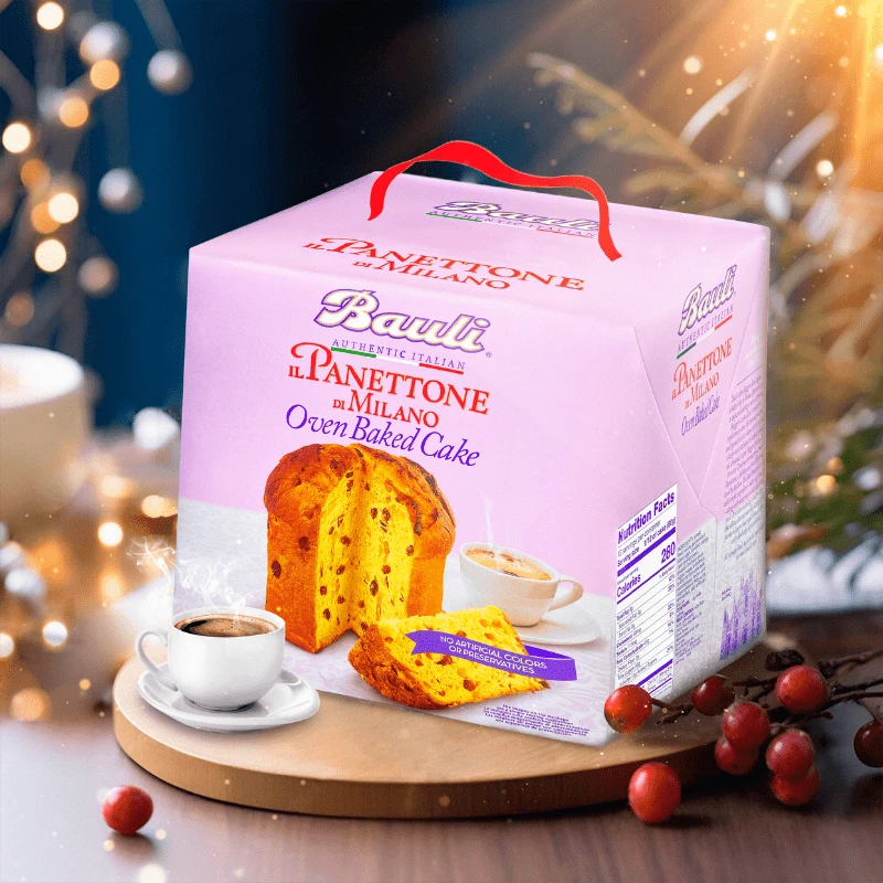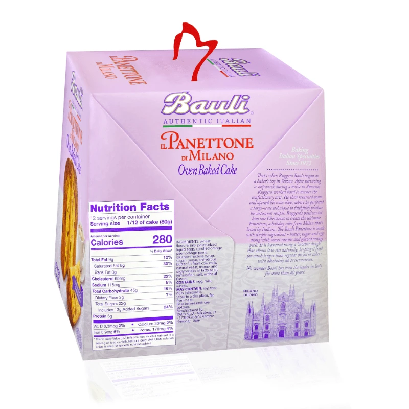 This Bauli Panettone is a soft Italian Christmas bread made with simple ingredients such as butter, sugar, and eggs. This semi-sweet confection gets its classic flavor from sweet raisins and candied orange peels. Give the Bauli Panettone as a gift for the holidays, or just get one for yourself! It makes a wonderful dessert for Christmas, birthdays, and other celebrations.