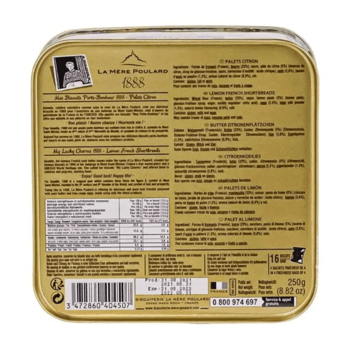 La Mere Poulard’s French lemon cookies palets are delicate golden cookies with a buttery flavor and a brittle consistency. To give these cookies their zesty yet delectable flavors, they are created with luscious lemon paste. These cookies are packed in a teal colored tin. Enjoy the lemon cookies with your favorite cup of coffee of tea.