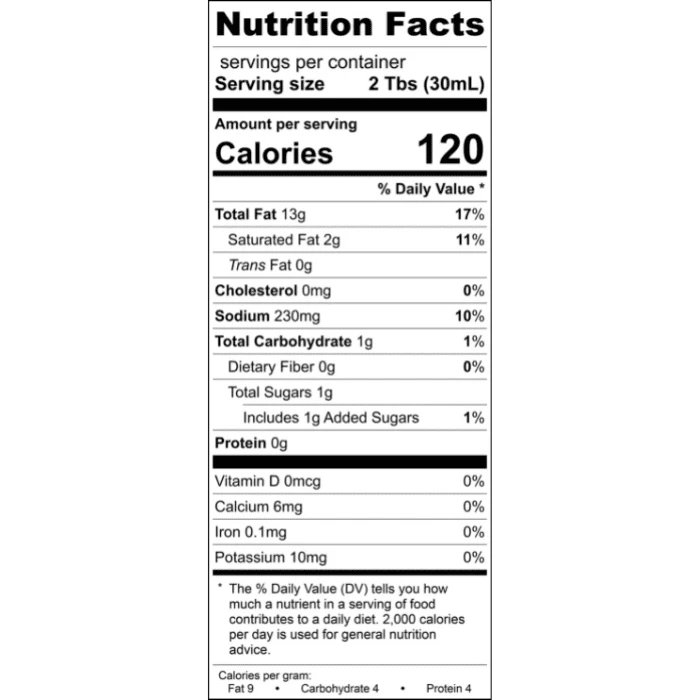 Soybean Oil, water, capers (capers, water, salt, and wine vinegar), distilled vinegar, olive oil, cucumber, cane sugar, dehydrated sour cream (cream, nonfat dry milk, cultures, salt), salt, butter flavor, xanthan gum, onions, propylene glycol alginate, lemon oil, turmeric, polysorbate 80, less than 1/10th of 1% potassium sorbate added as a preservative, calcium disodium, erythorbic acid and spices.Â