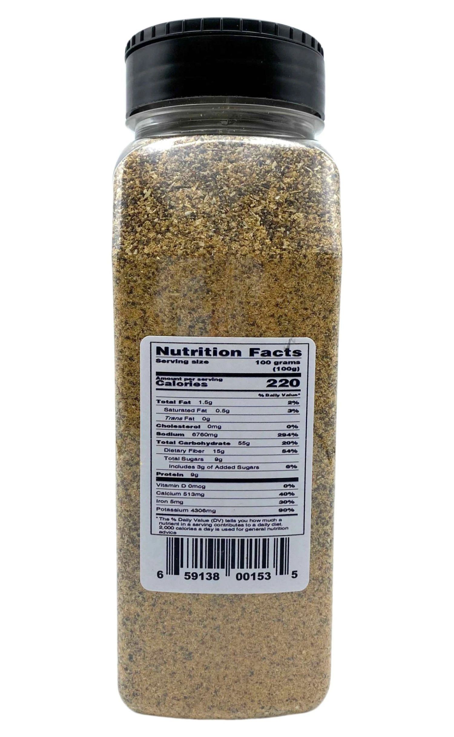 This seasoning contains a robust combination of pepper, garlic, onions, and other aromatics.