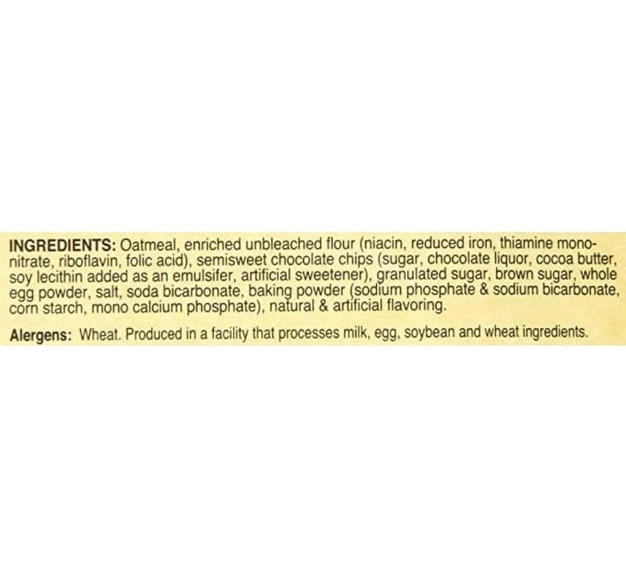 Oatmeal, enriched unbleached flour (niacin, reduced iron, thiamine mono-nitrate, riboflavin, folic acid), semisweet chocolate chips (sugar, chocolate liquor, cocoa butter, soy lecithin, artificial sweetner), granulated sugar, brown sugar, whole egg powder, salt, soda bicarbonate, baking powder (sodium phophate & sodium bicarbonate, corn starch mono calcium phosphate), natural and artificial flavoring