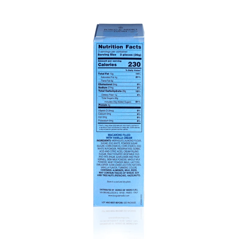 Macarons are quite simply one of the most beautiful cookies in the world. This meringue-based sandwich cookie from Borgo de Medici features a vanilla flavored cream in between two almond flour-based macaron shells. This crispy, light, airy cookie has a beautiful off-white color.