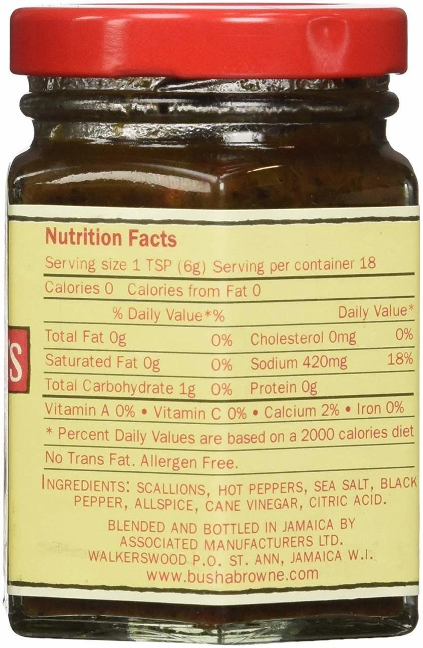 Scallions, Hot Peppers, Salt, Black Pepper, Allspice, Cane Vinegar, Citric Acid. All natural. No preservatives.