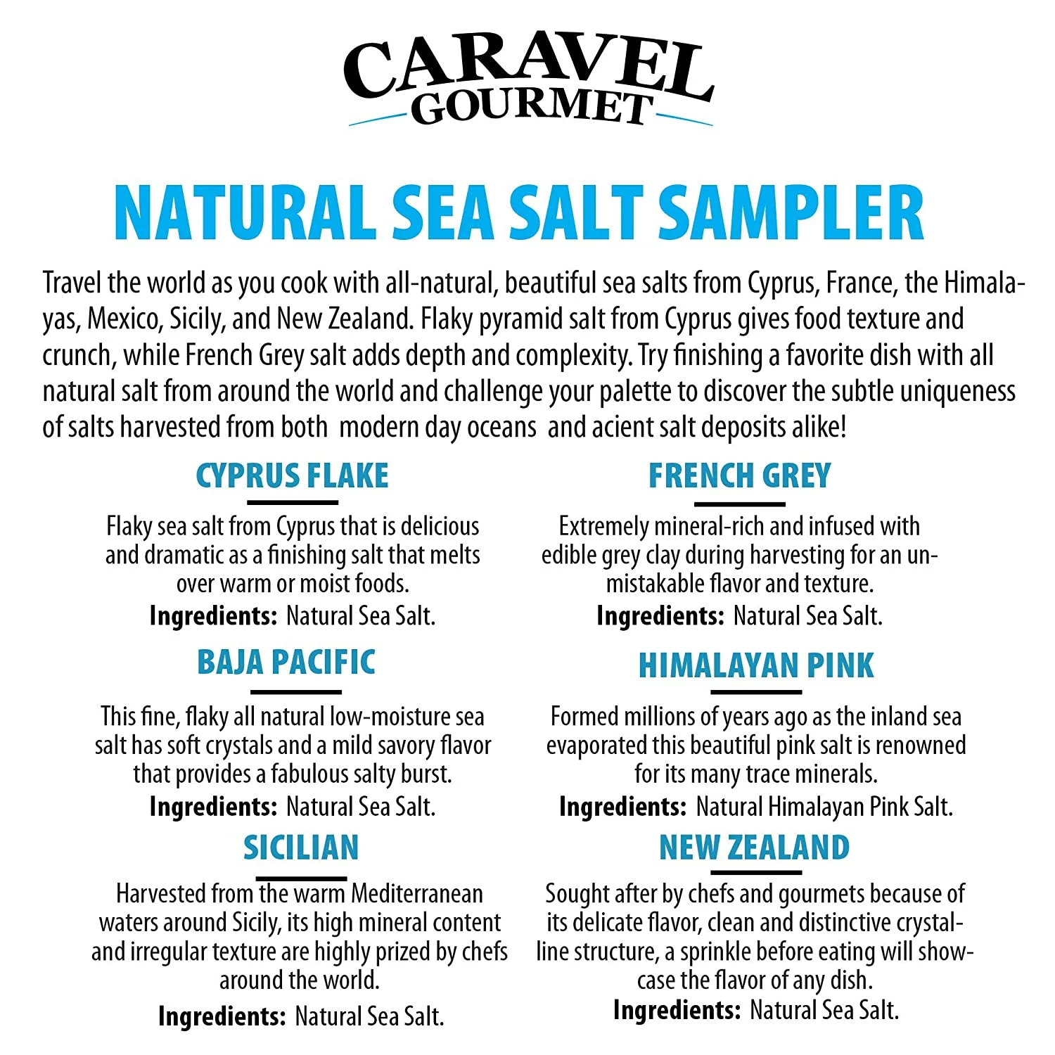 Caravel Gourmet Natural Sea Salt Sampler, 6 Tins is a lovely gift set that brings global flavors right to your kitchen. Each infusion in this gourmet salt collection bring its own unique flavor to any pasta sauce, grill recipe, or cocktail.