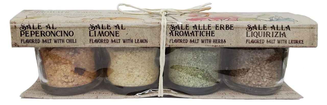 Casarecci Italian Aromatic Savory Salt Set contains four different types of flavored salt: pepperoncino (chili pepper), limone (lemon), erbe aromatiche (herbs) and liquirizia (licorice). Each little jar of salt offers a different yet uniquely Italian taste.
