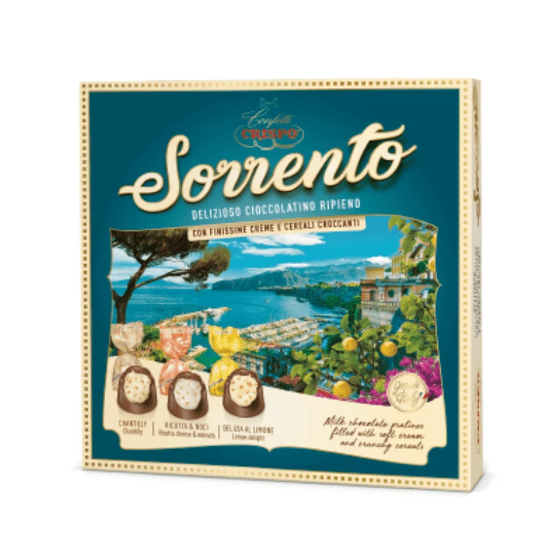 Crispo Confetti Positano Assorted Pralines includes Chantilly cream-, lemon delight-, and ricotta cheese with walnut flavors. These chocolate pralines make a delightful addition to a dessert platter with fresh fruit and caramel candies. They also pair well with coffee, tea, and dessert wine.