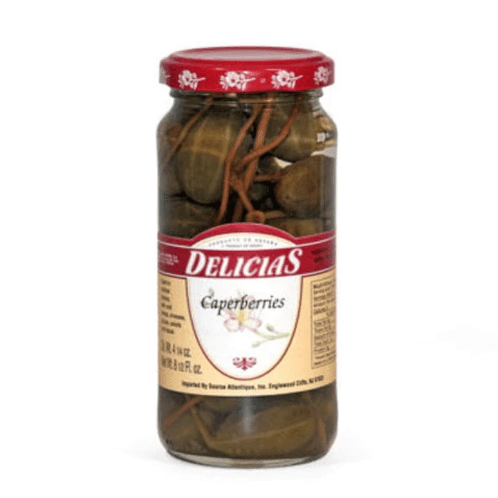 Caperberries are the fruit that comes from each flower bud of the caper bush (capparis spinosa). The berry grows from the caper plant as its flowers start to bloom. It is on a long stem. These berries are used in a wide range of recipes, including seafood and poultry dishes. Try them with smoked salmon or as part of a chicken piccata with garlic, lemon, and white wine. Or enjoy them on a charcuterie board with cured meats and Spanish cheeses such as fresh manchego. They’re a great way to decorate a martini, too!