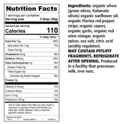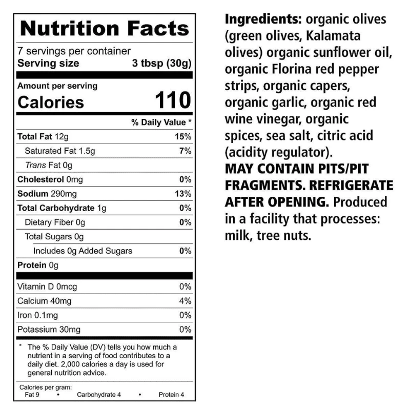 This tangy and briny olive spread is flavored with a mix of vinegar, red pepper, capers, garlic, salt, and spices.