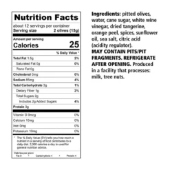 Pitted olives, water, cane sugar, white wine vinegar, dried tangerine, orange peel, spices, sunflower oil, sea salt, citric acid