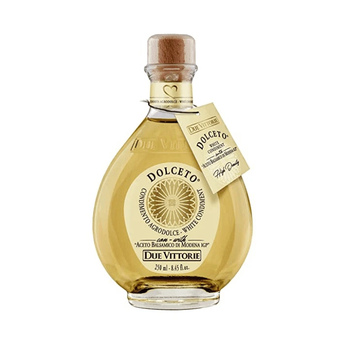 This Due Vittorie Dolceto White Balsamic Vinegar has a rich sweetness that blends harmoniously with a degree of acidity. It’s made with a mix of aromatic and sweet white grapes from Modena, Italy. Due to its clear golden color, you can use it to add the sweetness, freshness, and acidity of balsamic vinegar while still maintaining the color of a dish.