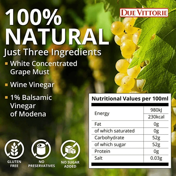 White concentrated grape must, wine vinegar, 1% balsamic vinegar of Modena