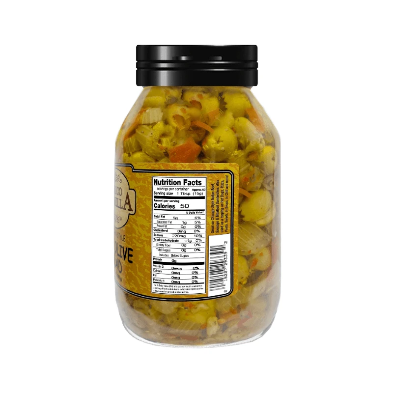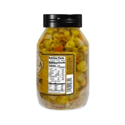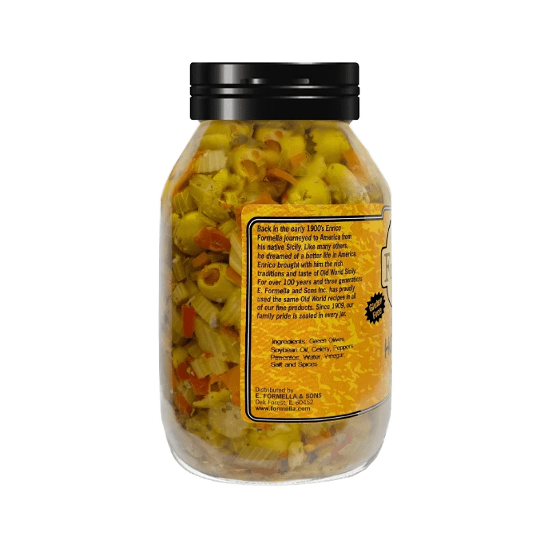 Enrico Formella Hot Olive Salad contains celery, bell peppers, and green olives pitted and stuffed with pimento pasta. These ingredients are marinated in a mix of oil and vinegar with a robust spice blend. Use this Sicilian olive salad recipe to give sandwiches, side dishes, and Mediterranean-style meals a spicy kick.