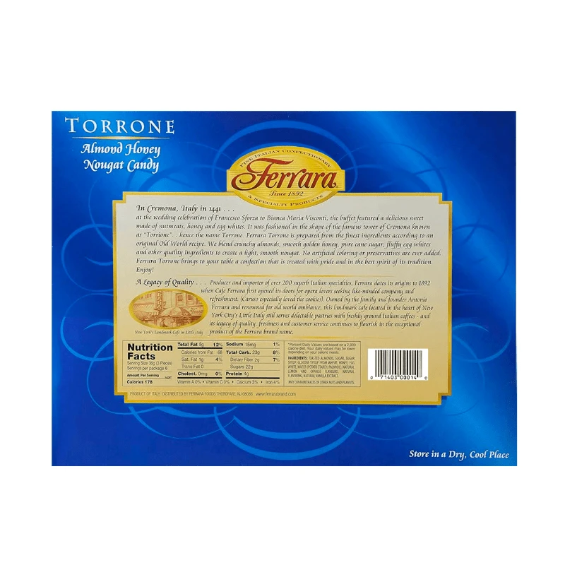 toasted almonds, sugar, sugar syrup, glucose syrup, honey, egg white, wafer (potato starch, olive oil), natural lemon flavor, natural orange flavor, natural vanilla flavor, natural vanilla bean extract and natural flavor.