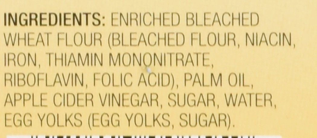 Enriched Bleached Wheat Flour (Bleached Flour, Niacin, Iron, Thiamin Mononitrate, Riboflavin, Folic Acid), Palm Oil, Apple Cider Vinegar, Sugar, Water Egg Yolks (Egg Yolks, Sugar).