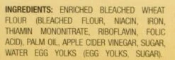 Enriched Bleached Wheat Flour (Bleached Flour, Niacin, Iron, Thiamin Mononitrate, Riboflavin, Folic Acid), Palm Oil, Apple Cider Vinegar, Sugar, Water Egg Yolks (Egg Yolks, Sugar).