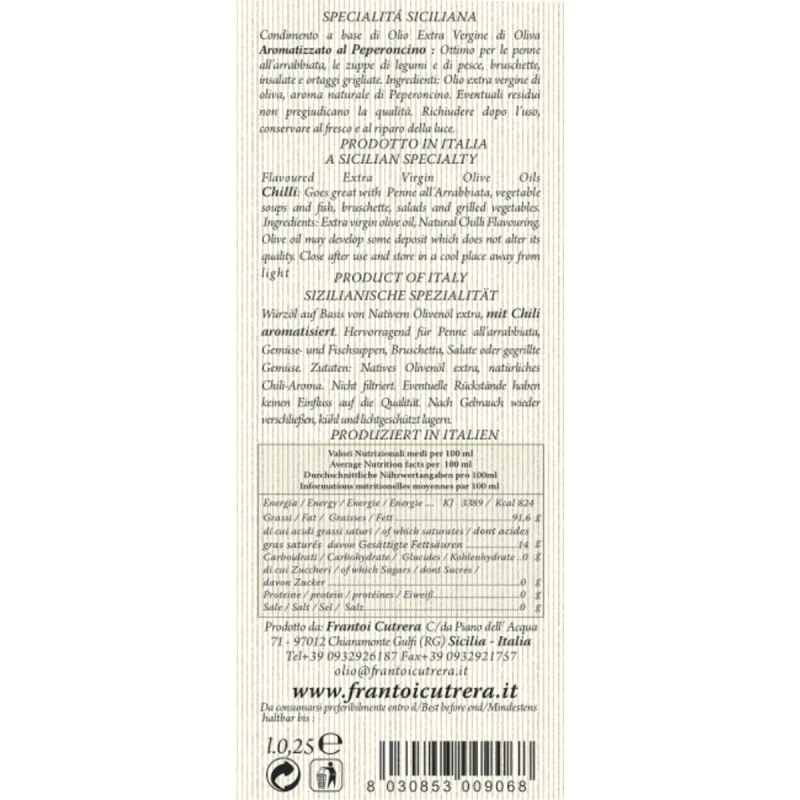 Frantoi Cutrera Chili Pepper Flavored Extra Virgin Olive Oil is an aromatic finishing oil. This high-quality olive oil infused with dried chili peppers provides the perfect balance of flavor and heat. Use this hot pepper oil to flavor french fries, salads, pasta dishes, and other savory recipes.