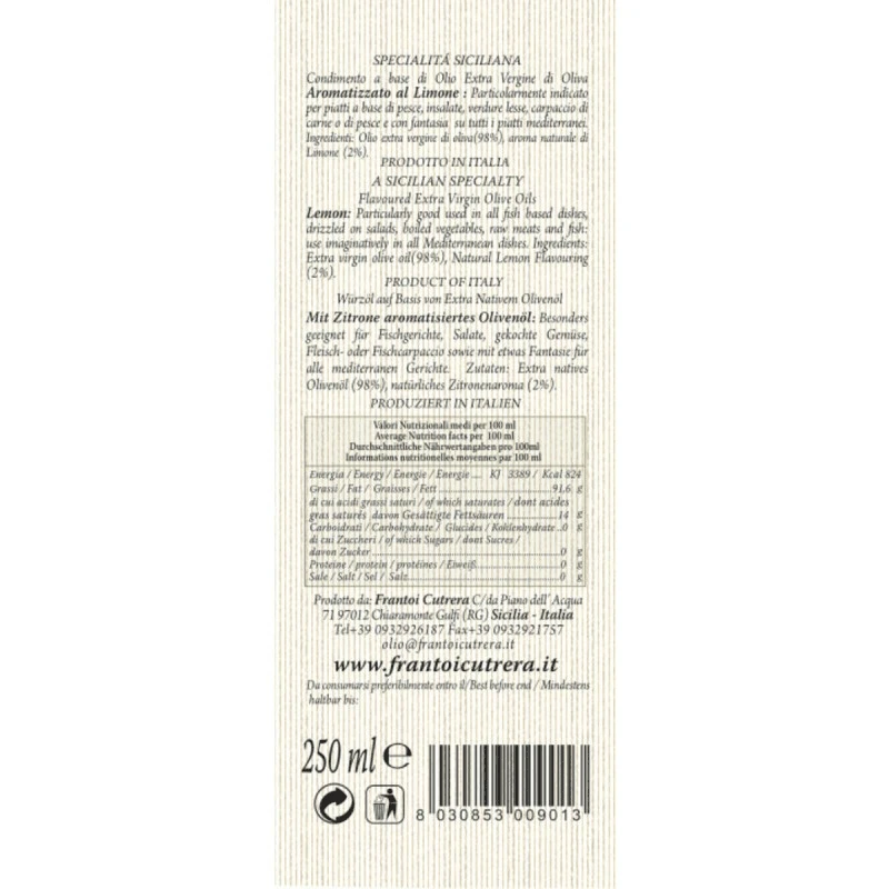 Frantoi Cutrera Lemon Flavored Extra Virgin Olive Oil is an aromatic finishing oil. This high-quality olive oil infused with lemons has a rich, citrusy flavor. Use this Sicilian extra virgin olive oil to flavor french fries, green tomatoes, salads, pasta dishes, and other savory recipes.