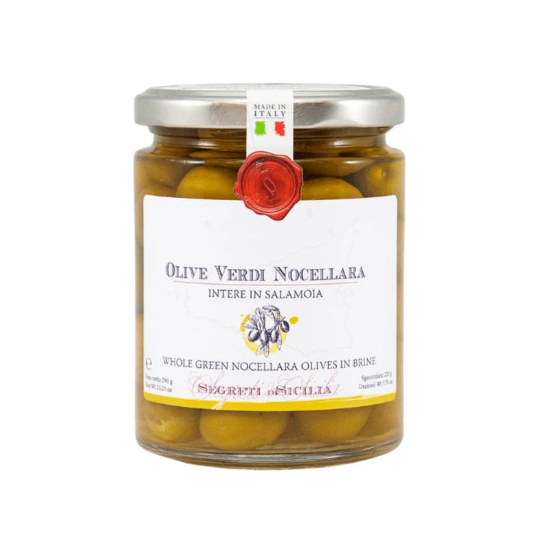 Frantoi Cutrera Green Nocellara Olives in Brine are a specialty product grown on the estate of the namesake award-winning maker of extra virgin olive oil. Nocellara olives are known for their buttery flavor, which is balanced here with a salty brine. Serve these tasty green olives on a charcuterie platter with Italian cheeses such as pecorino romano, toss with salads, or mix this type of olive with your favorite tomato sauces for extra acidity. Or enjoy them on a table olive platter alongside marinated or oil-cured black olives. Pair with fruity flavored wines or hard ciders.