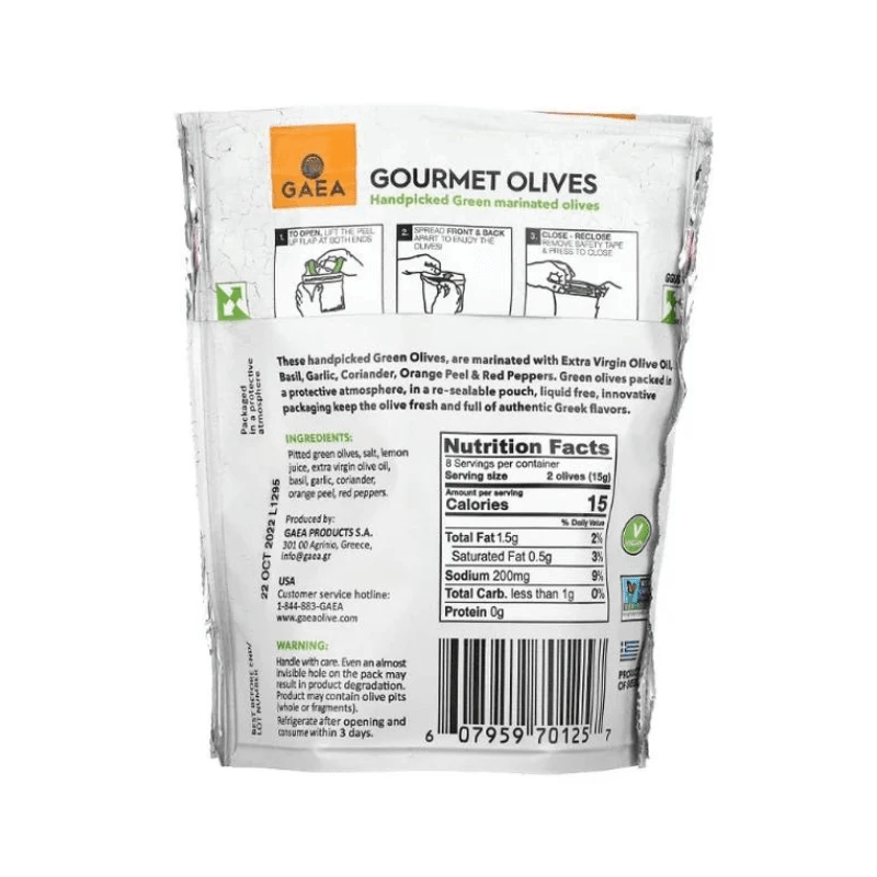 Gaea Marinated Green Olives are pitted and marinated in oil with lemon juice, basil, garlic, and other aromatics. These flavorful olives make a delicious addition to a charcuterie board with cured meats and Mediterranean cheeses. Try these hand-picked olives on an appetizer platter with fresh fruit and soft cheeses. Alternatively, you can serve this high-quality olives with a Martini, Bloody Mary, or a similar cocktail. Or even add these gourmet olives to a gift basket for any special occasion.