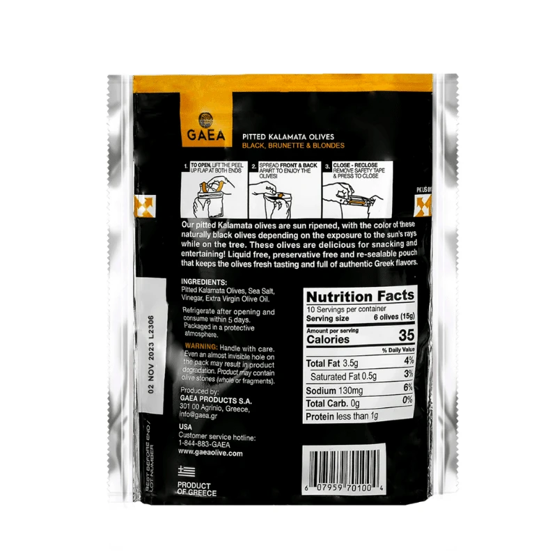 Mixed pitted kalamata olives, sea salt, vinegar, extra virgin olive oil.