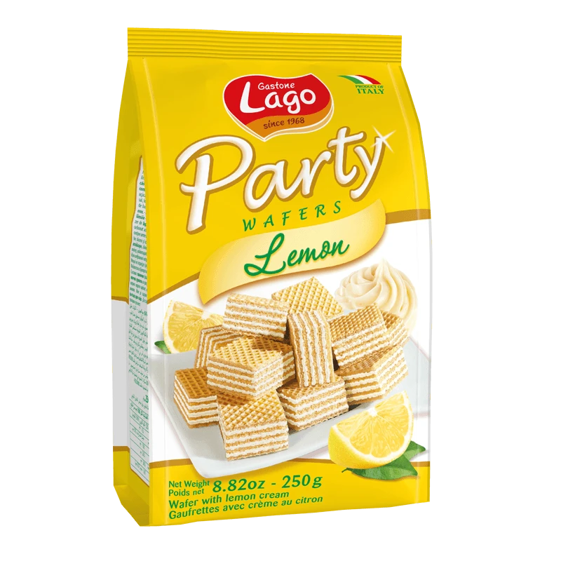 Gastone Lago Lemon Wafers are pure heaven in the shape of a cube. Layers of creamy, zesty lemon complement stacks of golden, crunchy wafers. When combined in these bite-sized desserts, they create irresistible taste and texture. These delicious wafer treats are perfect for sharing at a party or for movie night. Crush them up and use them in a muffin recipe!