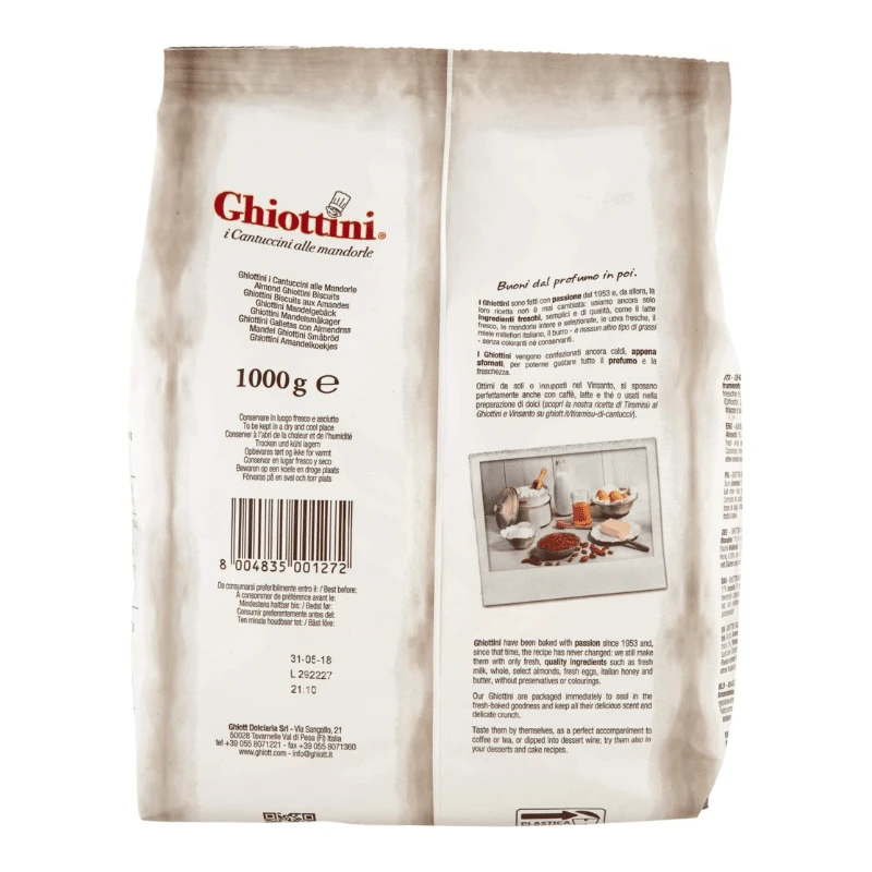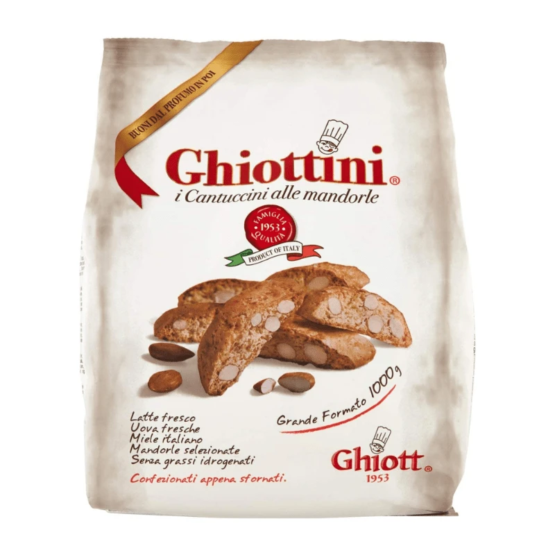 Ghiott Ghiottini Cantuccini alle Mandorle are a type of Tuscan biscotti that are filled with almonds. With a firm yet porous texture, these Italian almond biscotti are perfect for dunking in a cup of coffee or tea. Add these imported Italian cookies to a gift basket for holidays, birthdays, and any other special occasion.