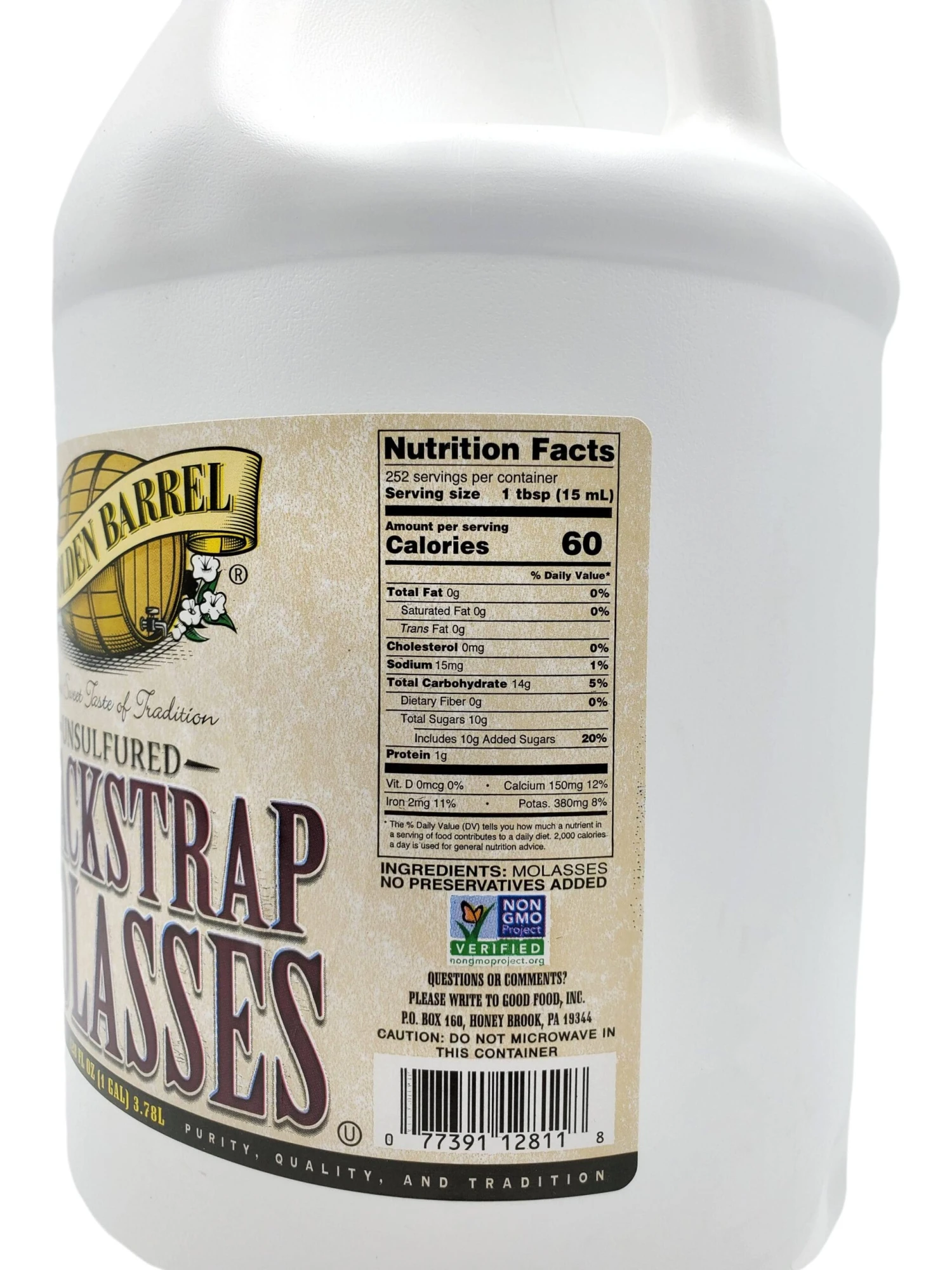 Golden Barrel Blackstrap Molasses is a sulfer-free, dark, bittersweet molasses with many nutrients, including vitamin B6, calcium, manganese, and magnesium. It is used as a health supplement as well as an ingredient in barbecue sauces, marinades, and baked goods.