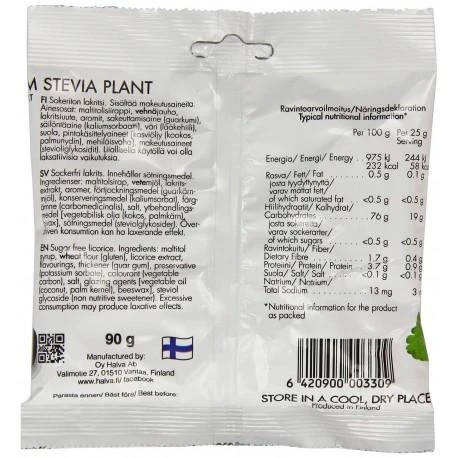 Maltitol syrup, wheat flour, licorice extract, flavors, thickener (E412 – Guar gum ), preservative (E202 – Potassium sorbate ), color (E153 – Vegetable carbon ), salt, glazing agents [vegetable oil (coconut, palm kernel), E901 – Beeswax, white and yellow ], sweetener (steviol glycoside).