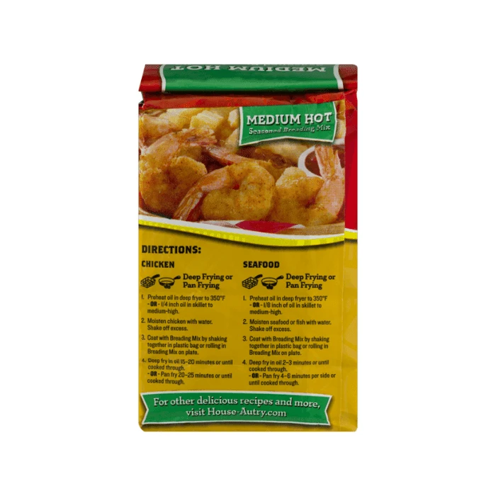 With House Autry Medium Hot Seasoned Breading Mix, you can make crispy and tasty fried chicken, pork, and vegetable dishes. It’s made with a spicy seasoned flour mixture and can be deep-fried or cooked in a pan or oven. Easily prepare your dishes in about 15 minutes with this spiced coating mix.
