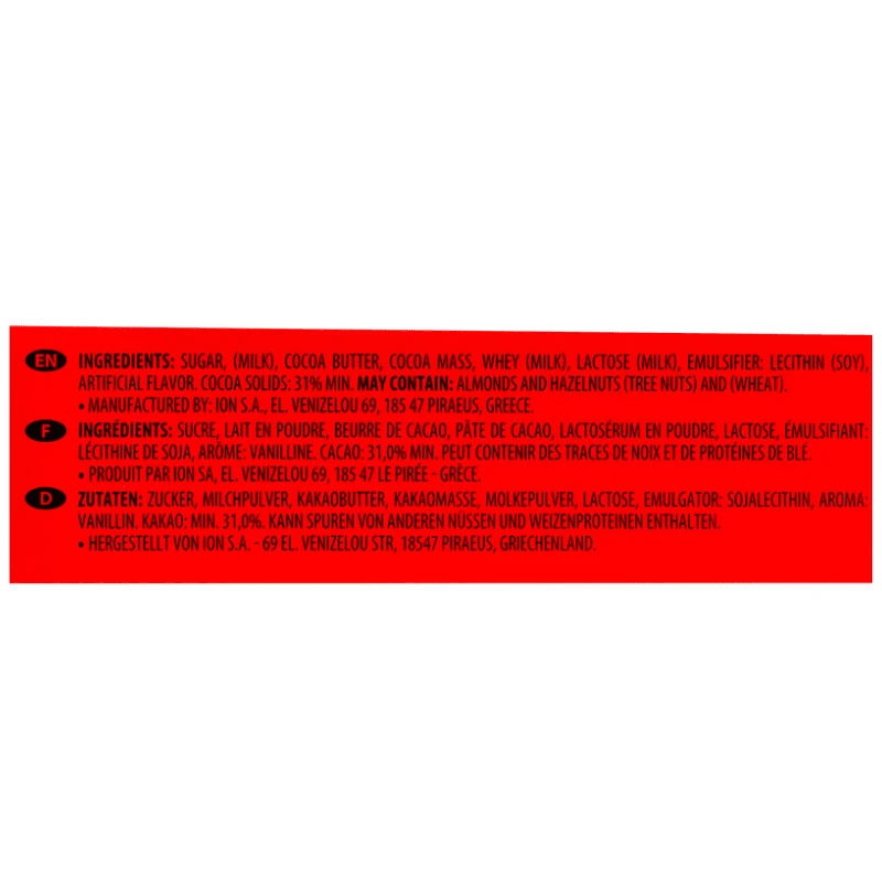 Sugar, milk powder, cocoa butter, cocoa mass, whey powder, lactose, emulsifier: soy lecithin, flavor: vanillin, cocoa solids 31.00% min