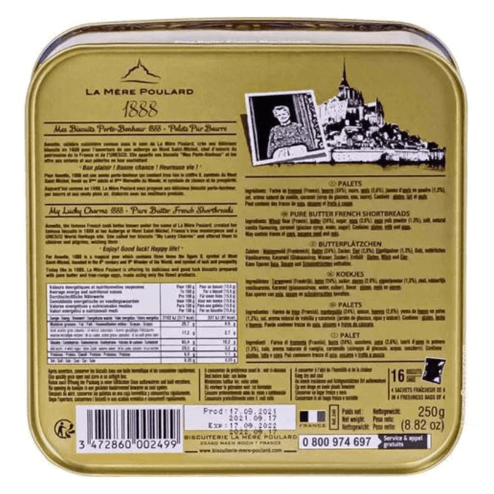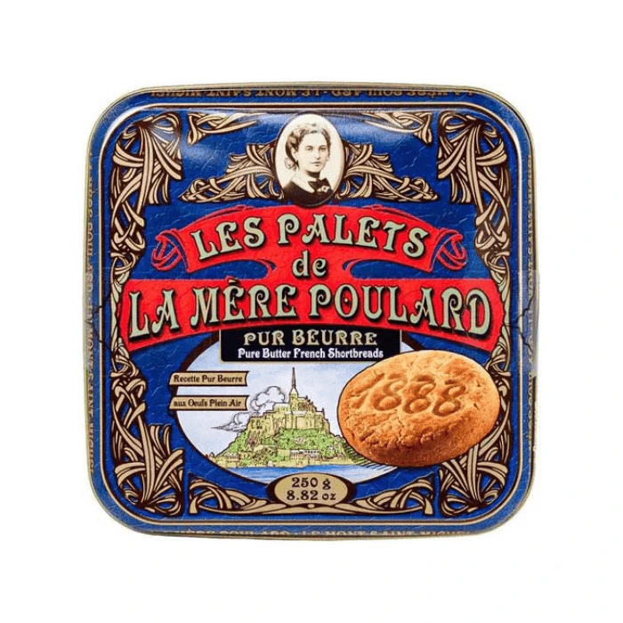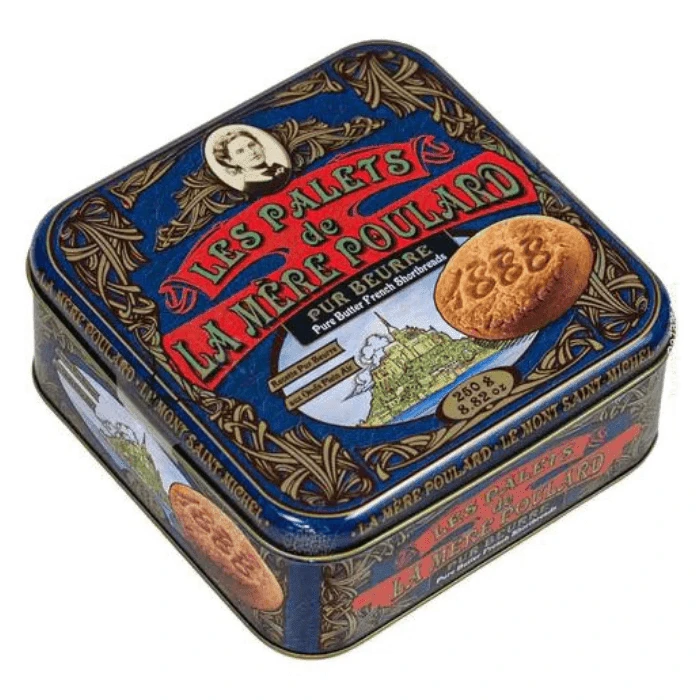 French butter cookies, also known as Les Palets by La Mère Poulard, are thick, round French cookies with a cheerfully crumbly consistency and a golden color. These buttery shortbreads come in a brightly colored tin box. Butter biscuits from La Mère Poulard go well with cappuccino, coffee, or even tea.