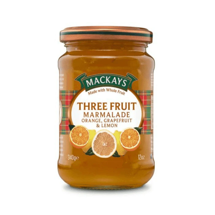 Orange, lemons, and grapefruit aromas combine in this zesty marmalade. Made in Scotland’s Dundee region which is the marmalade capital of the world. Mackays Three Fruit Marmalade is prepared in copper pans. This marmalade also makes a wonderful addition to a gift basket for any celebration.
