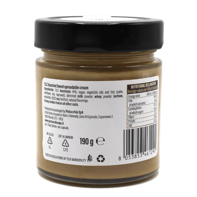 T.G.T Hazelnuts 45%, sugar, vegetable oils and fats (palm, sunflower, soy, rapeseed), skimmed milk powder, whey powder, lactose, emulsifier: E322 soy lecithin), natural flavoring. It may contain traces of other nuts.