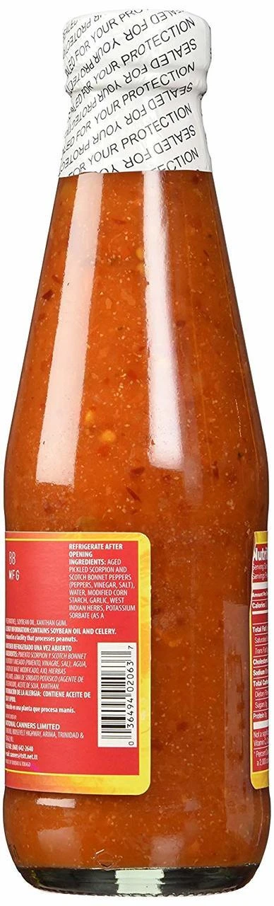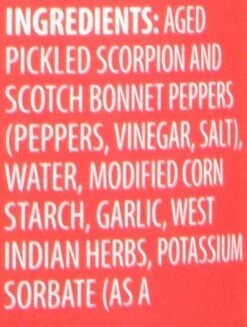 Aged pickled Scorpion and Scotch Bonnet peppers (peppers, vinegar, salt), water, modified corn starch, garlic, West Indian herbs, potassium sorbate