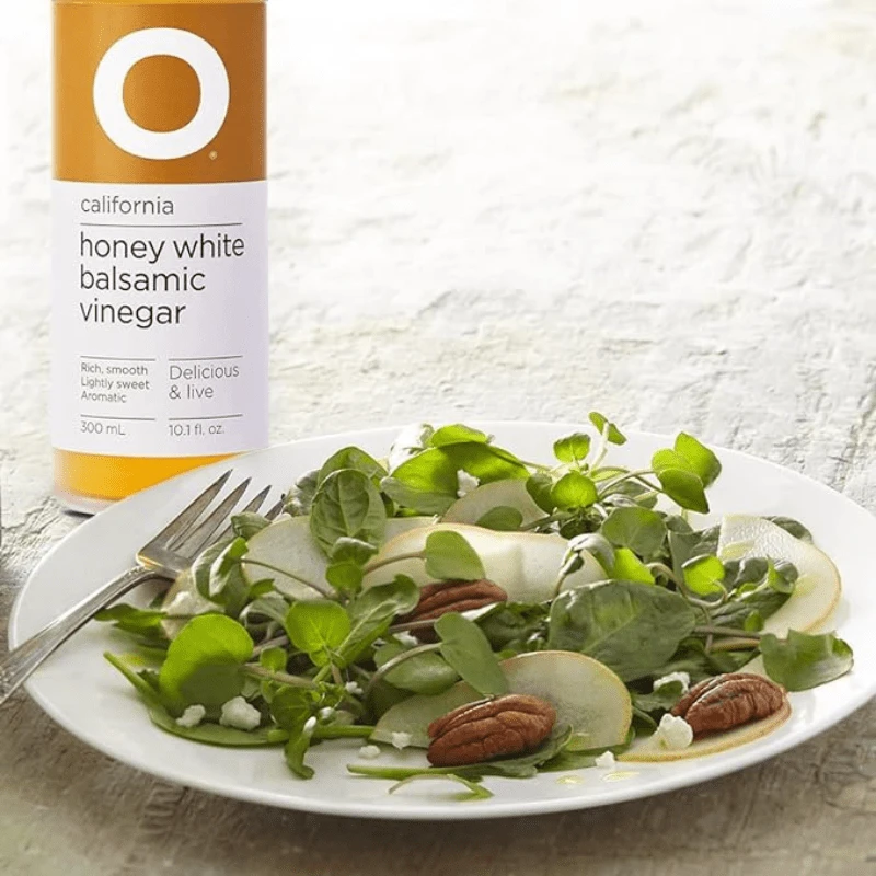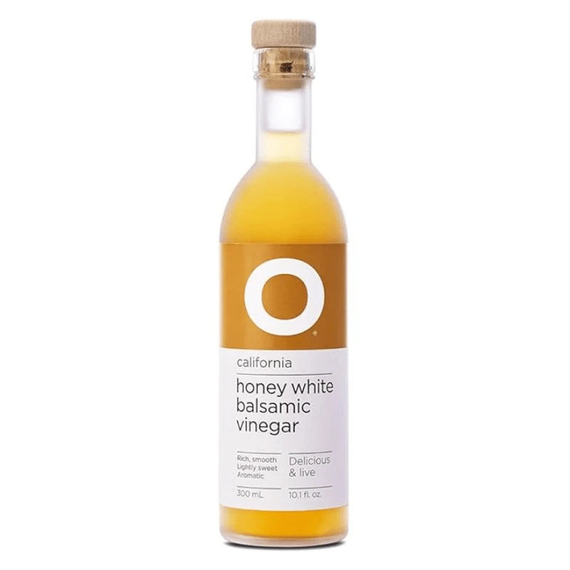 O California Honey White Balsamic Vinegar is a sweet and tangy vinegar condiment with muscat grape juice and clover honey. The zesty and sweet flavor of this vinegar is perfect for fresh green salads.