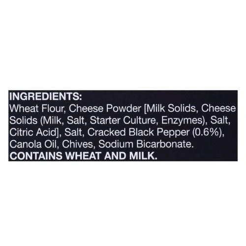 Wheat flour, cheese powder [milk solids cheese solids (milk salt starter culture enzymes) salt citric acid] salt, cracked black pepper (0.6%) canola oil, chives, sodium bicarbonate.