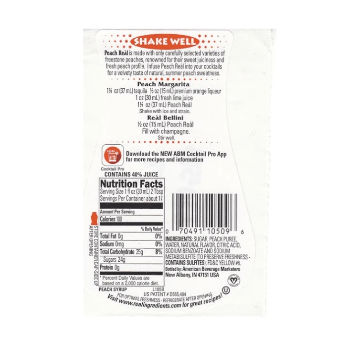 Sugar, Peach Puree, Natural Flavor, Water, Citric Acid, Malic Acid, Sodium Benzoate and Sodium Metabulsifite (to preserve freshness), FD&C Yellow #6