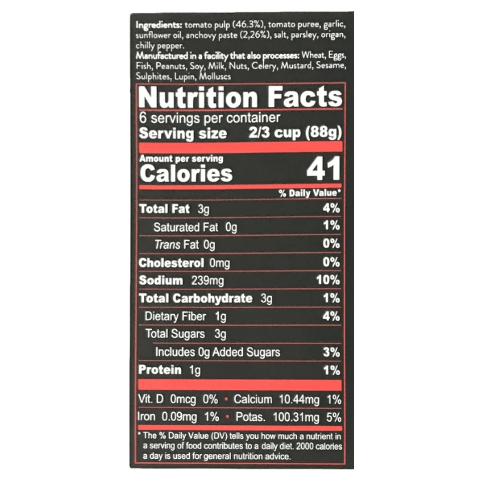 Tomato pulp (46.3%), tomato puree, sunflower oil, garlic, anchovies paste (2.26%), salt, parsley, oregano, chili pepper.