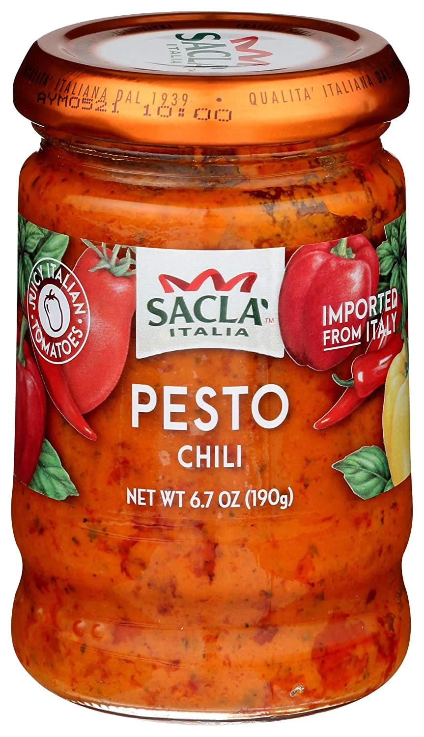 Made with seasonal raw materials and absolutely no colorings or artificial preservatives, Sacla Chili Pesto is a spicy pesto that combines hot chilis, red peppers, and tomatoes.