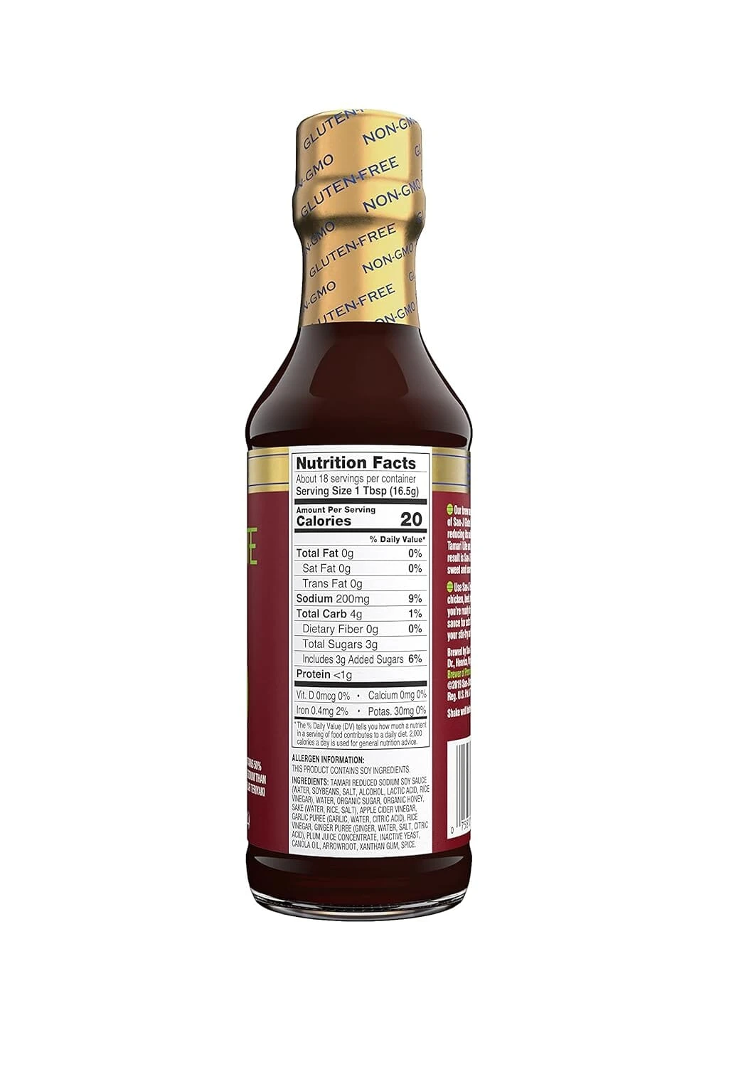 Tamari Reduced Sodium Soy Sauce (Water, Soybeans, Salt, Alcohol, Lactic Acid, Rice Vinegar), Water, Organic Sugar, Organic Honey, Sake (Water, Rice, Salt), Apple Cider Vinegar, Garlic Puree (Garlic, Water, Citric Acid), Rice Vinegar, Ginger Puree (Ginger, Water, Salt, Citric Acid), Plum Juice Concentrate, Inactive Yeast, Canola Oil, Arrowroot, Xanthan Gum, Spice.