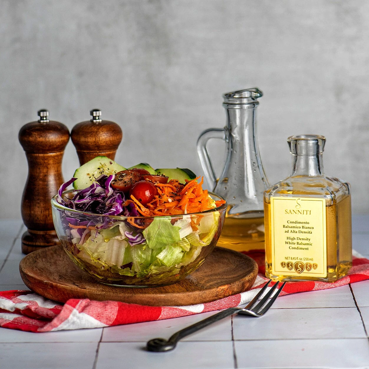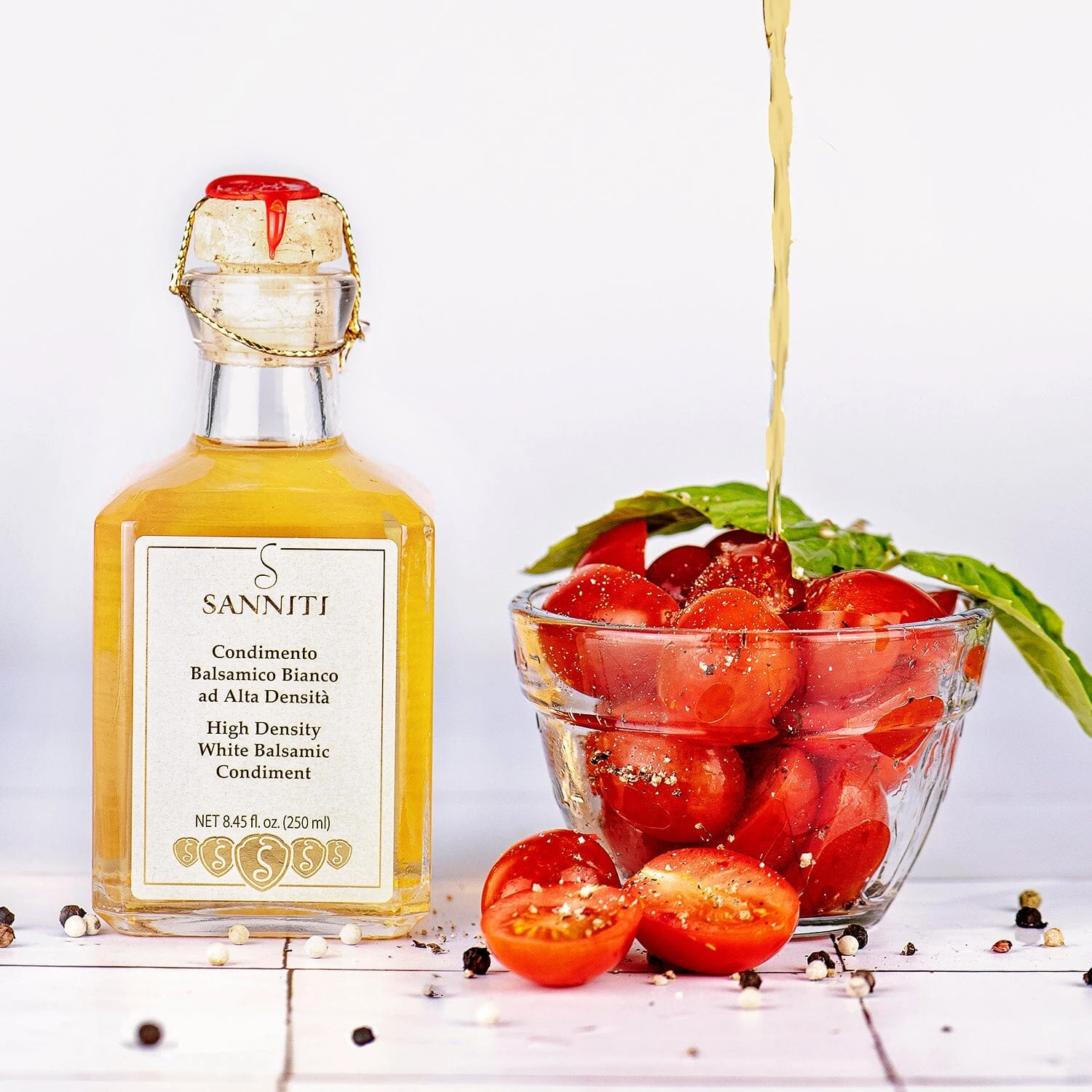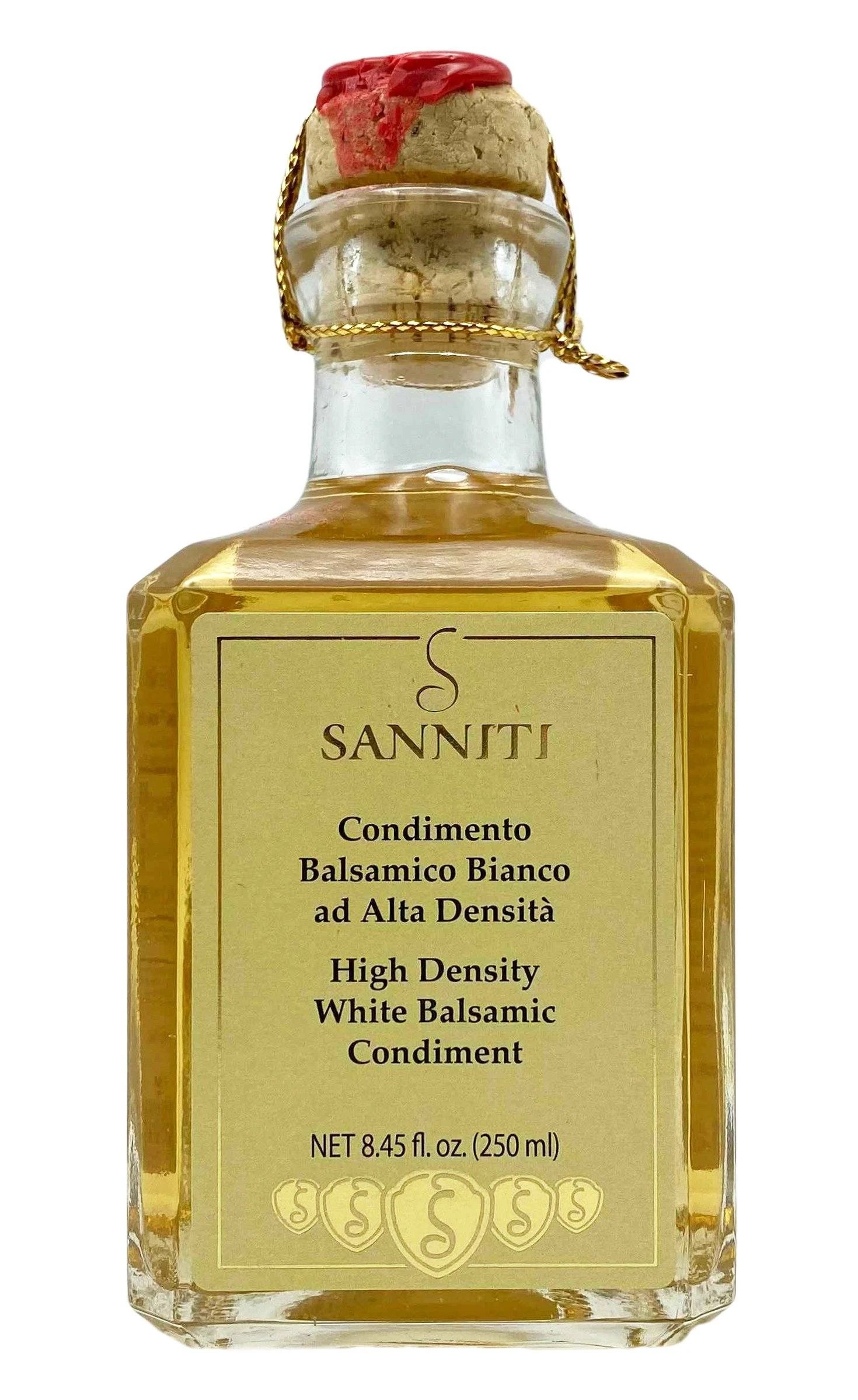 Sanniti Balsamic High Density White Vinegar is made with concentrated grape must, which includes the grape’s skin, pulp, and seeds, before being aged in oak barrels. The result is a sharp and tangy condiment perfect for salad dressings, white meat, and fish.