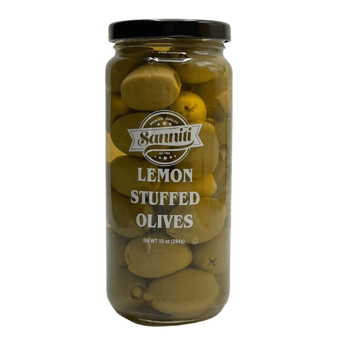Sanniti Lemon Stuffed Olives marries tangy, briny flavors with bright citrus for this unique gourmet snack. Get zesty, fruity and salty tasting notes all in one bite! Preserved in a mixture of salted water and vinegar, this almond-shaped olive variety is similar to Kalamata olives grown in Greece.