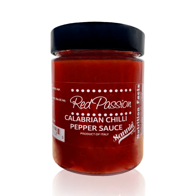 Sanniti Red Passion Chili Pepper Sauce is a bold tomato sauce made with Calabrian chili peppers and acacia honey. Enjoy this spicy pepper sauce in a pasta recipe with Italian sausage and freshly grated parmesan cheese. Try it as a spread on a panini with melted cheese and fresh herbs. Or serve this tomato and red pepper sauce with dry-cured meats and Italian cheeses on a charcuterie platter.