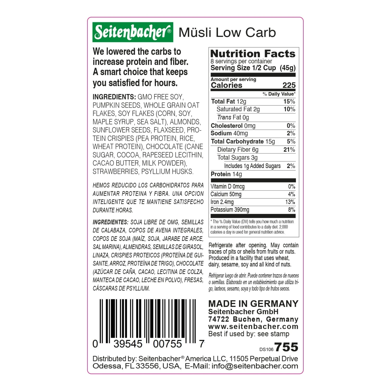 GMO FREE SOY, PUMPKIN SEEDS, WHOLE GRAIN OAT FLAKES, SOY FLAKES (CORN, SOY, MAPLE SYRUP, SEA SALT), ALMONDS, SUNFLOWER SEEDS, FLAXSEED, PROTEIN CRISPIES (PEA PROTEIN, RICE, WHEAT PROTEIN), CHOCOLATE (CANE SUGAR, COCOA, RAPESEED LECITHIN, CACAO BUTTER, MILK POWDER), STRAWBERRIES, PSYLLIUM HUSKS.