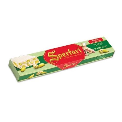 Torrone is a traditional Italian nougat candy that is especially popular around the Christmas season. This Sperlari torrone bar is made with soft nougat and studded with Italian pistachios. It’s the perfect stocking stuffer and makes a wonderful addition to a gift basket.