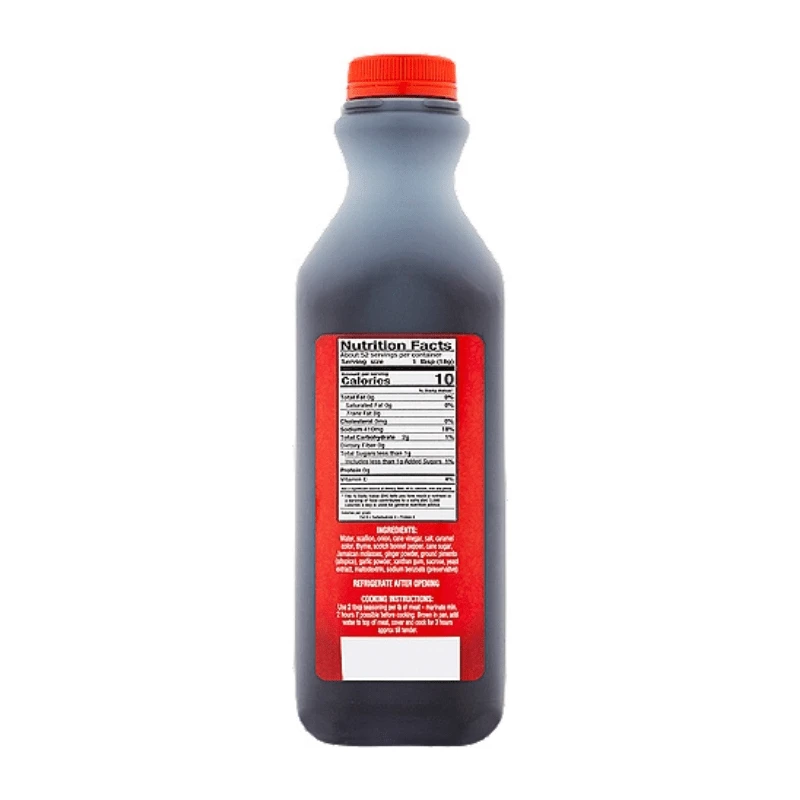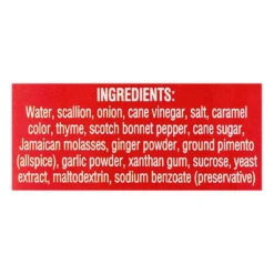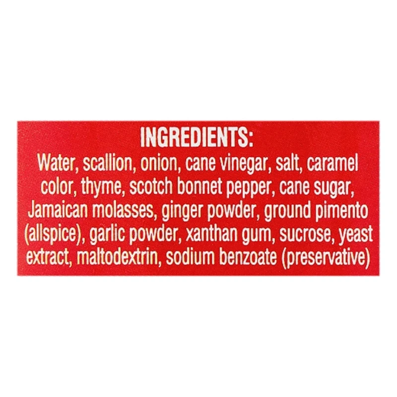 Water; Scallion; Onion; Cane Vinegar; Salt; Caramel Color; Thyme; Scotch Bonnet Pepper; Cane Sugar; Jamaican Molasses; Ginger Powder; Ground Pimento (Allspice); Garlic Powder; Xanthan Gum; Sucrose; Yeast Extract; Maltodextrin; Sodium Benzoate (Preservative);